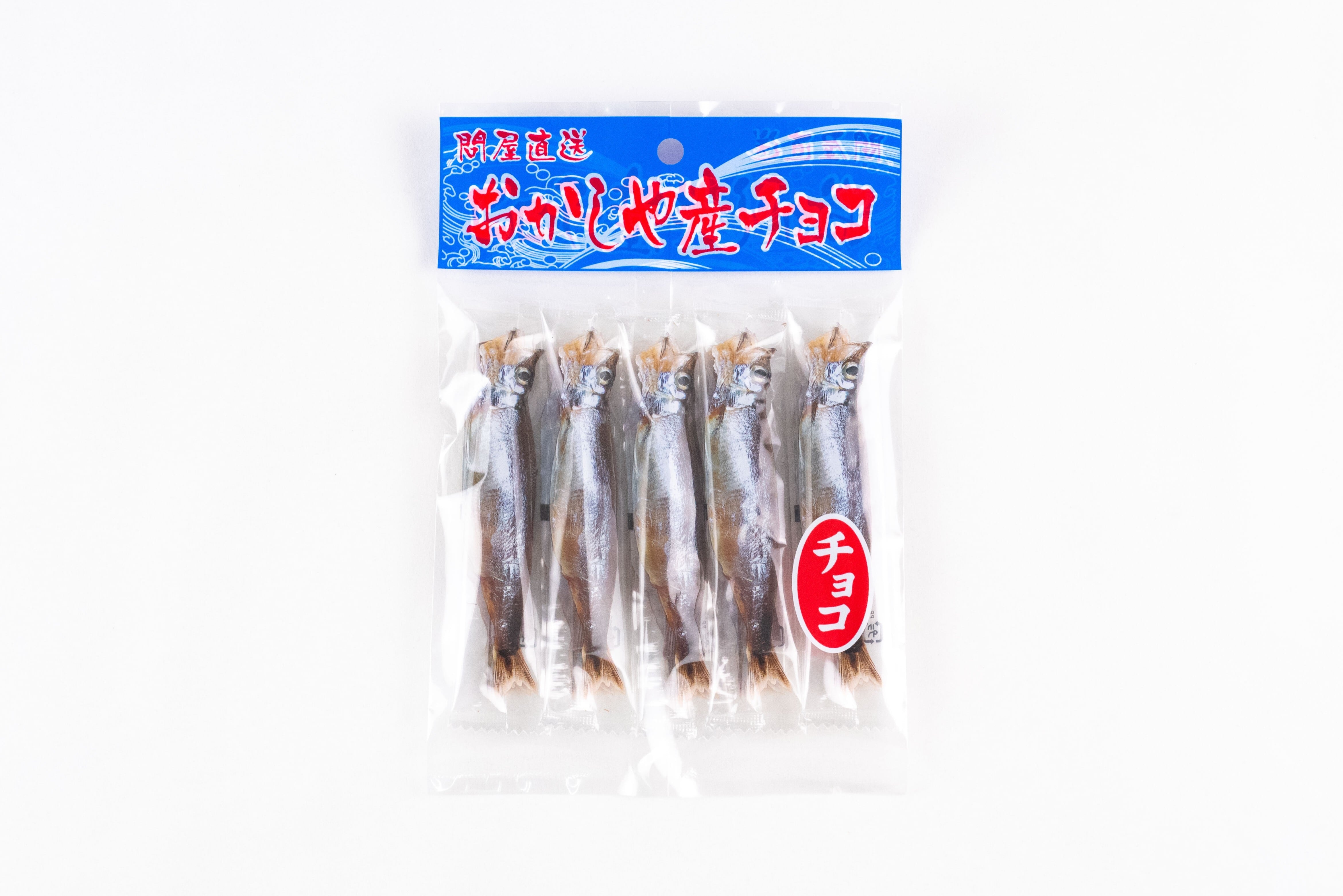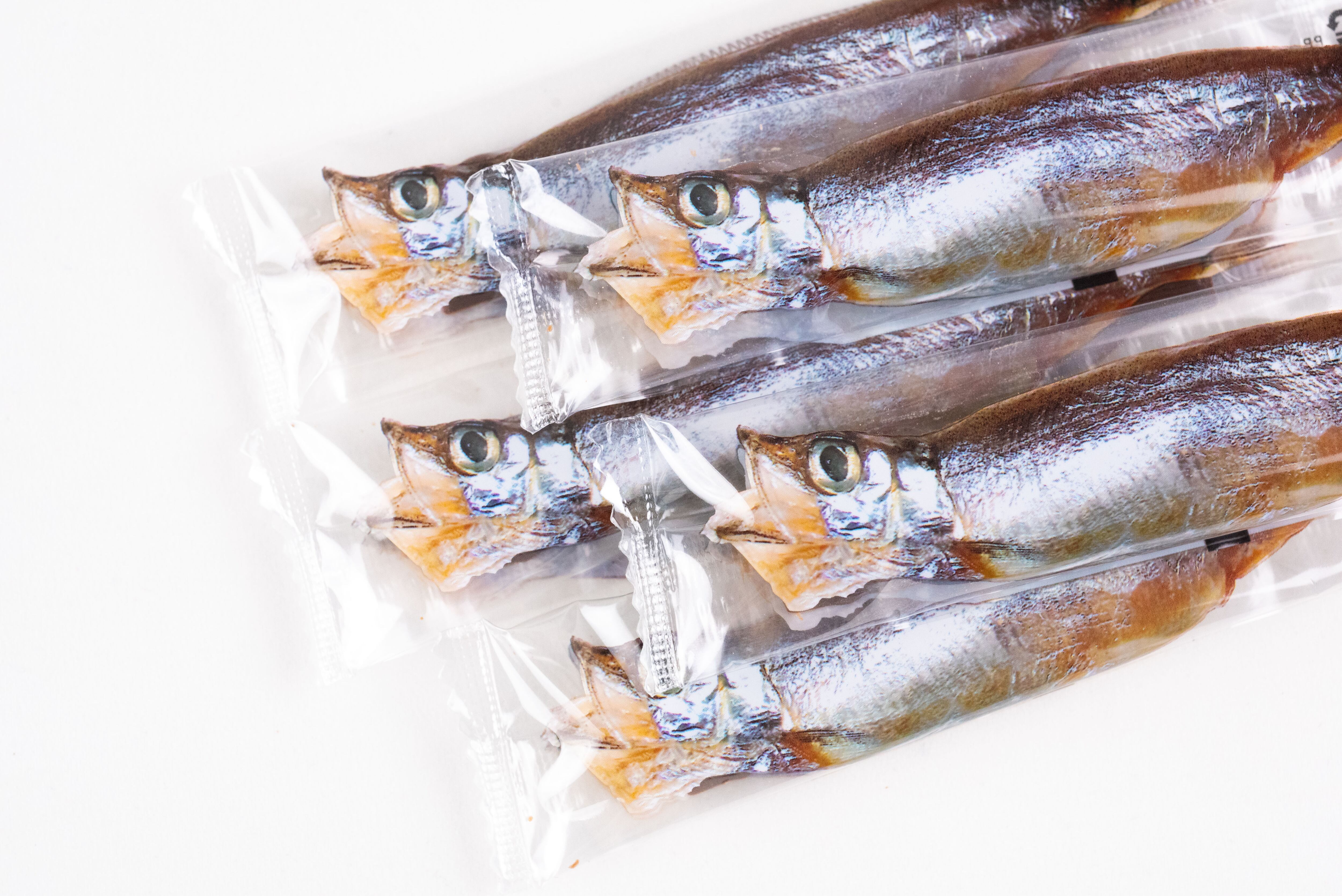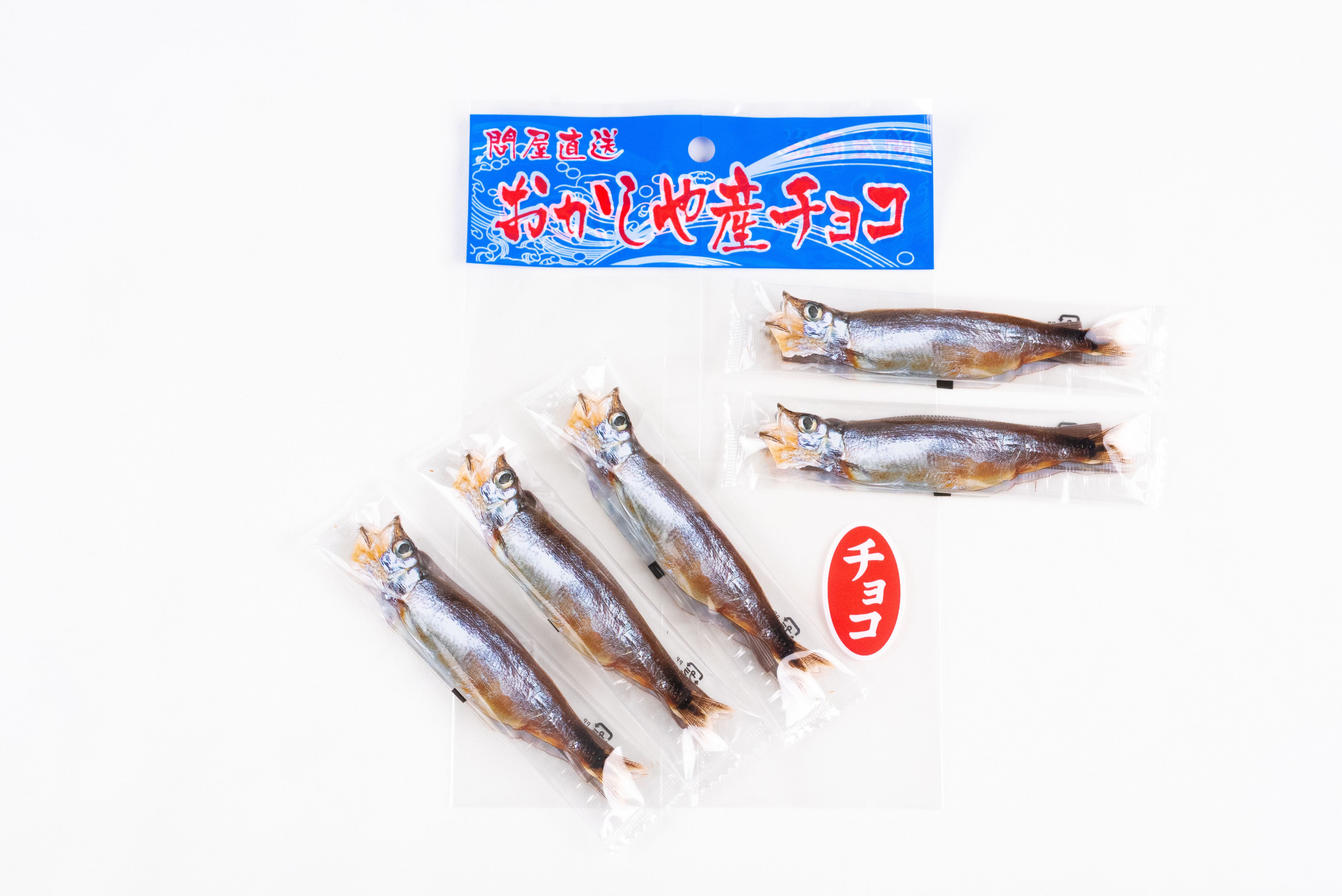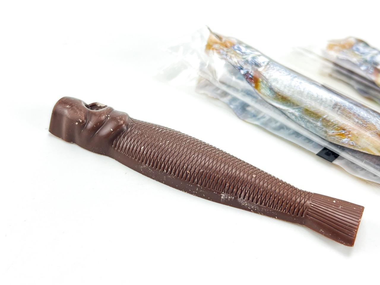 鮮魚店で売られているようなパッケージを開けると、中には魚の形を精巧に模した個包装のししゃもチョコが5本。